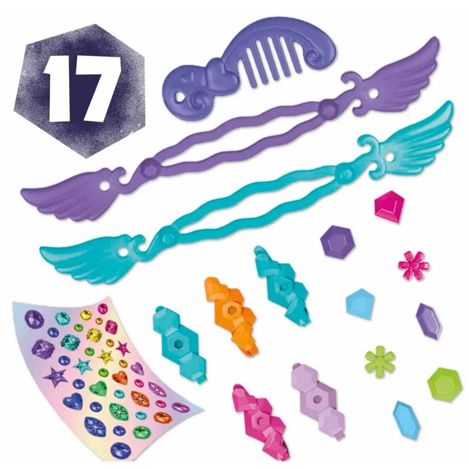 Kutuya dahil saç topuzu yapma aletleri ve kurdelelerle birbirinden havalı saç tasarımları ve topuzlar yapın. 17 aksesuar kutuya dahildir. Minik aksesuarlar, tokalar ve şekillendirme aletleriyle Sunny'nin saçına özel şekiller verin ve mücevher çıkartmalarıyla süsleyin!