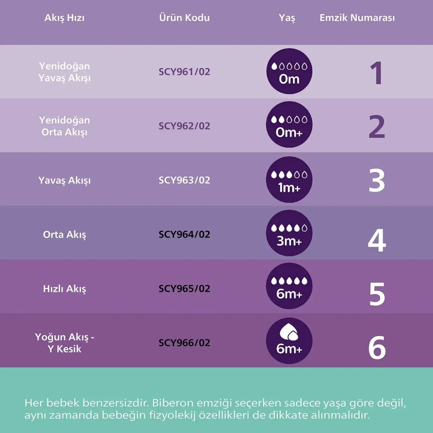 Bebeğiniz için doğru emzik akış hızını seçin; Her bebek farklı beslenir ve kendi hızında gelişir. Bebeğiniz için mükemmel akış hızını bulabilmeniz ve biberonunuzu kişiselleştirebilmeniz için bir dizi akış hızı tasarladık. Doğal Tepkili Biberon Emziklerinin tümü yumuşak silikondan üretilmiştir.