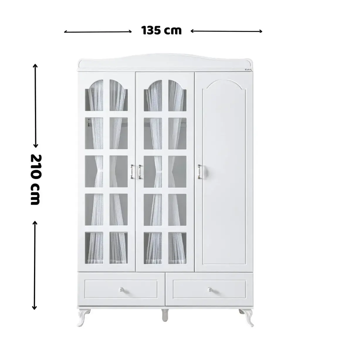 - 3 Kapılı Dolap, 6 cm x 135 cm x 210 cm ölçülerindedir.