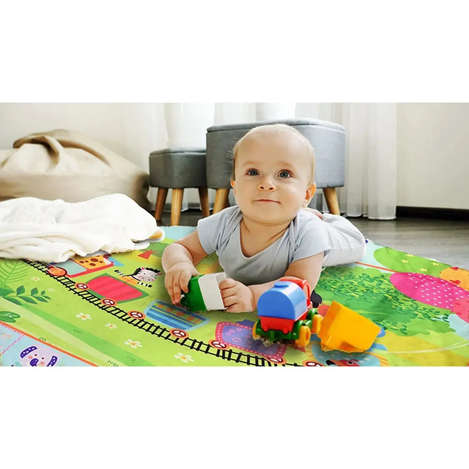 - Canlı renkleri ve tasarımları bebeğinizin odasında halı olarak kullanılmasını da sağlar