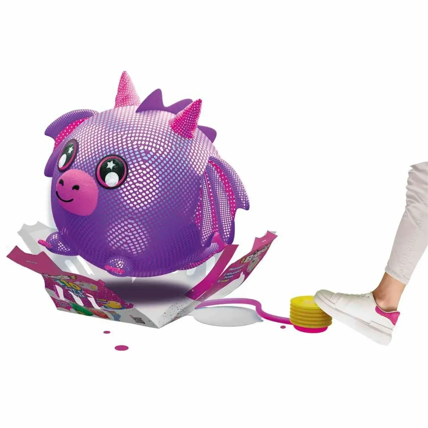 Şişirildiğinde orijinal boyutunun 10 katına kadar büyüyebilir. Pelüş, gizemli bir kutu içinde gelir; şişirme pompasını ortaya çıkartın ve peluş büyümeye başlayana kadar pompalayın. Pompalamaya devam ettiğinizde peluşün xxl boyutlarına ulaştığını görecek ve çok eğleneceksiniz. Açılış deneyimi, oyun sürecinin bir parçası haline gelir. Peluş, tekrar kullanılabilir, söndürülebilir ve kolayca saklanabilir.