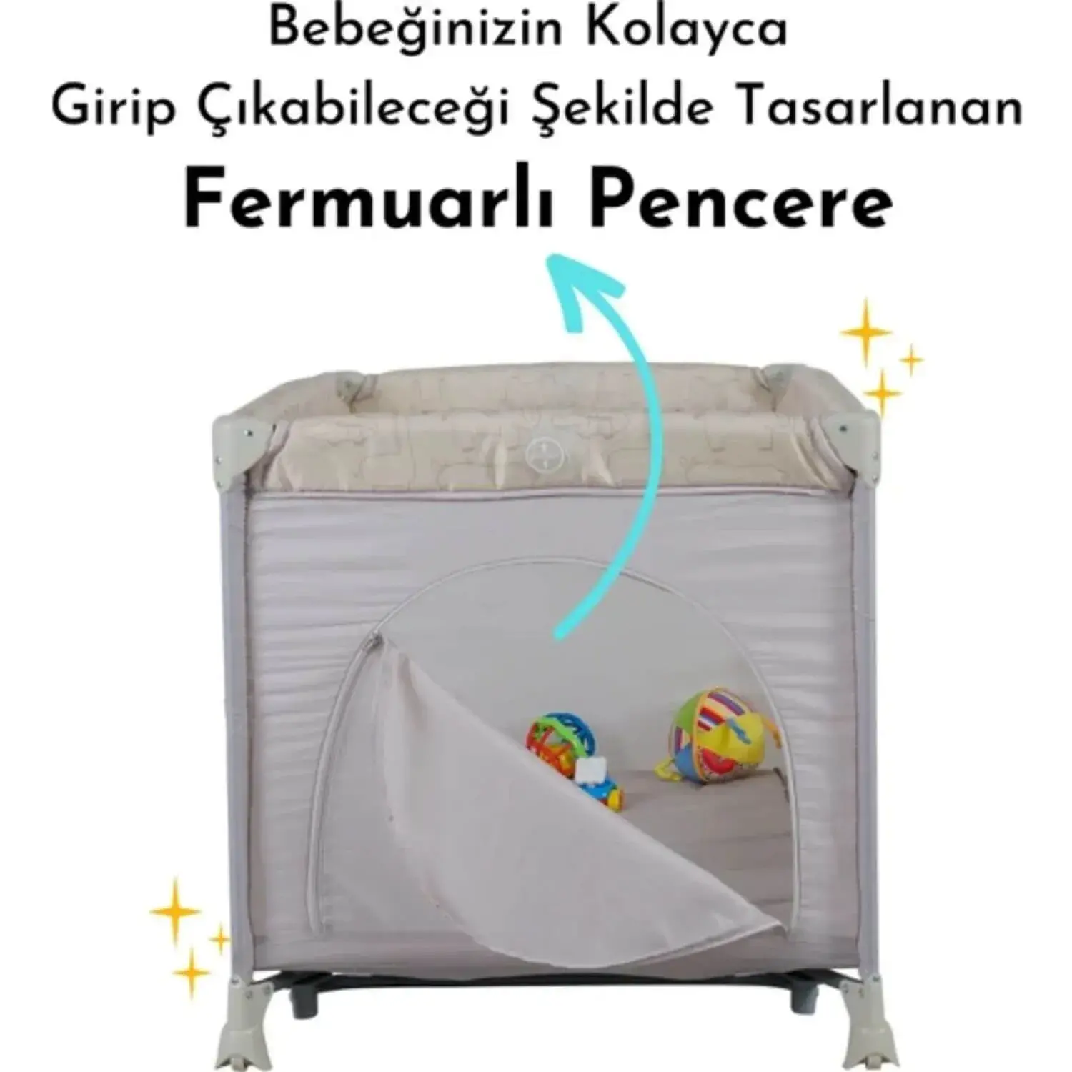 - Kısa kenarda bebeğin parka kolaylıkla girip çıkabileceği fermuarlı pencere Portatif cibinlik