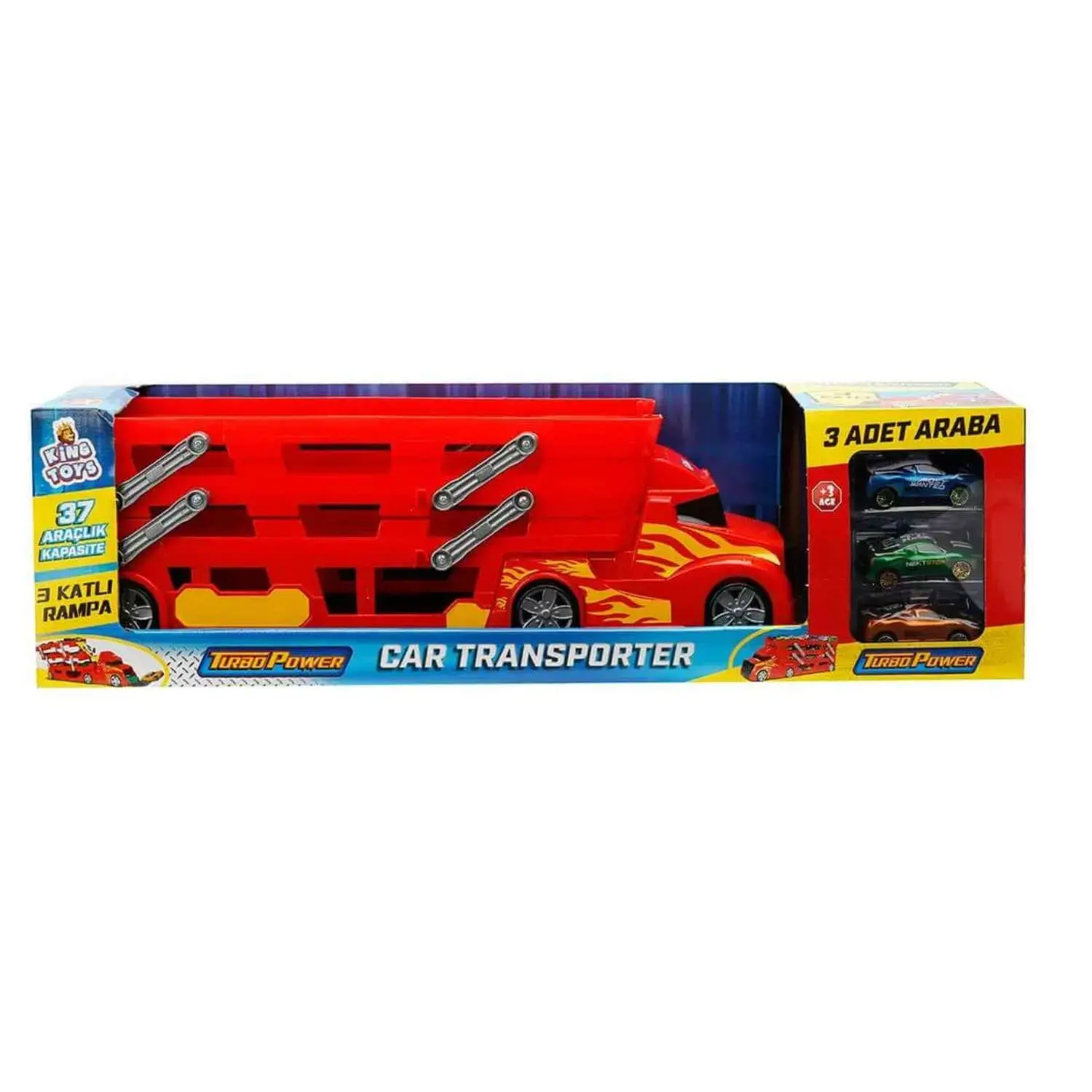 Kutu içerisindeki 3 arabayla hız ve heyecan dolu yarışın keyfini çıkar! Üstelik 37 araç kapasiteli transporter tır sayesinde eğlencenin dozunu 37’ye katla!