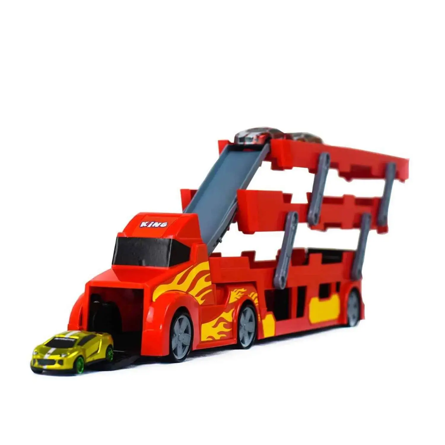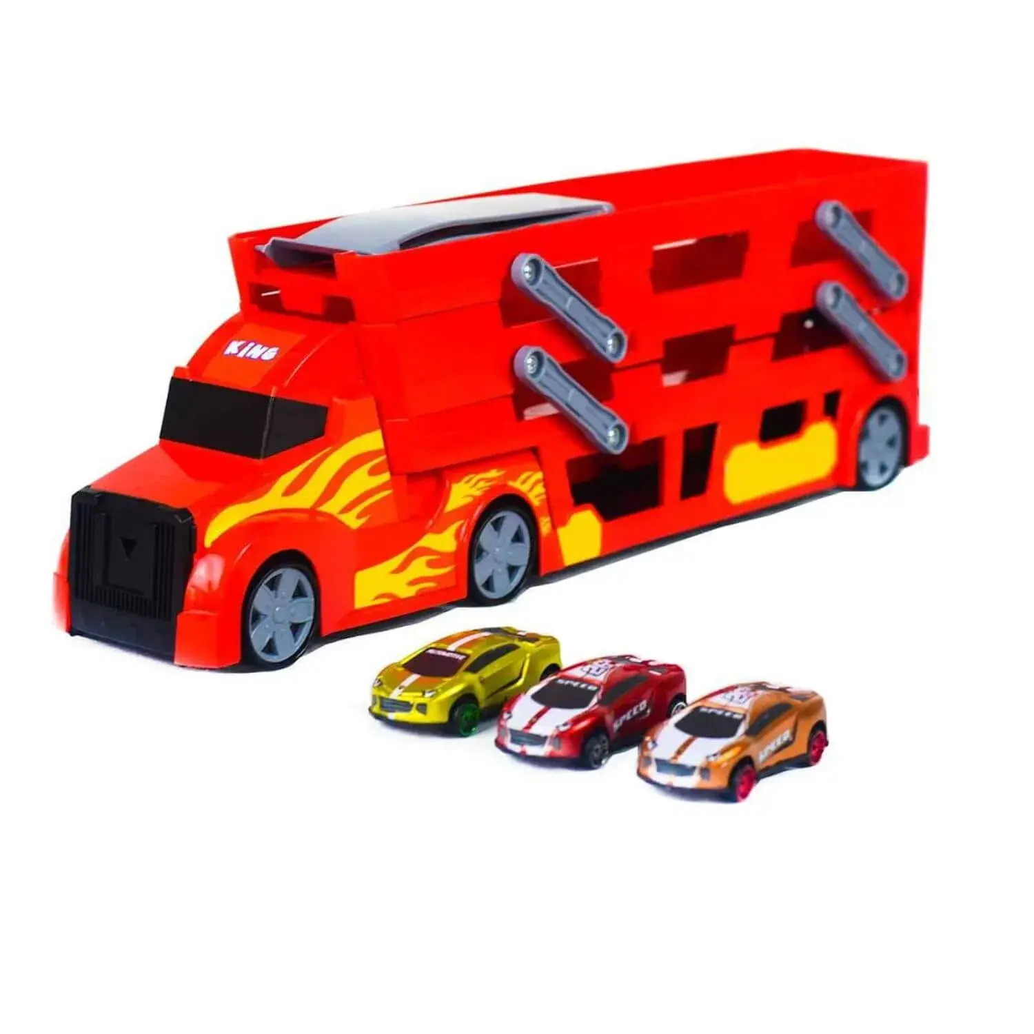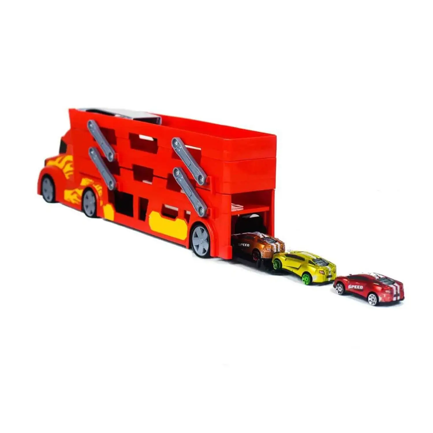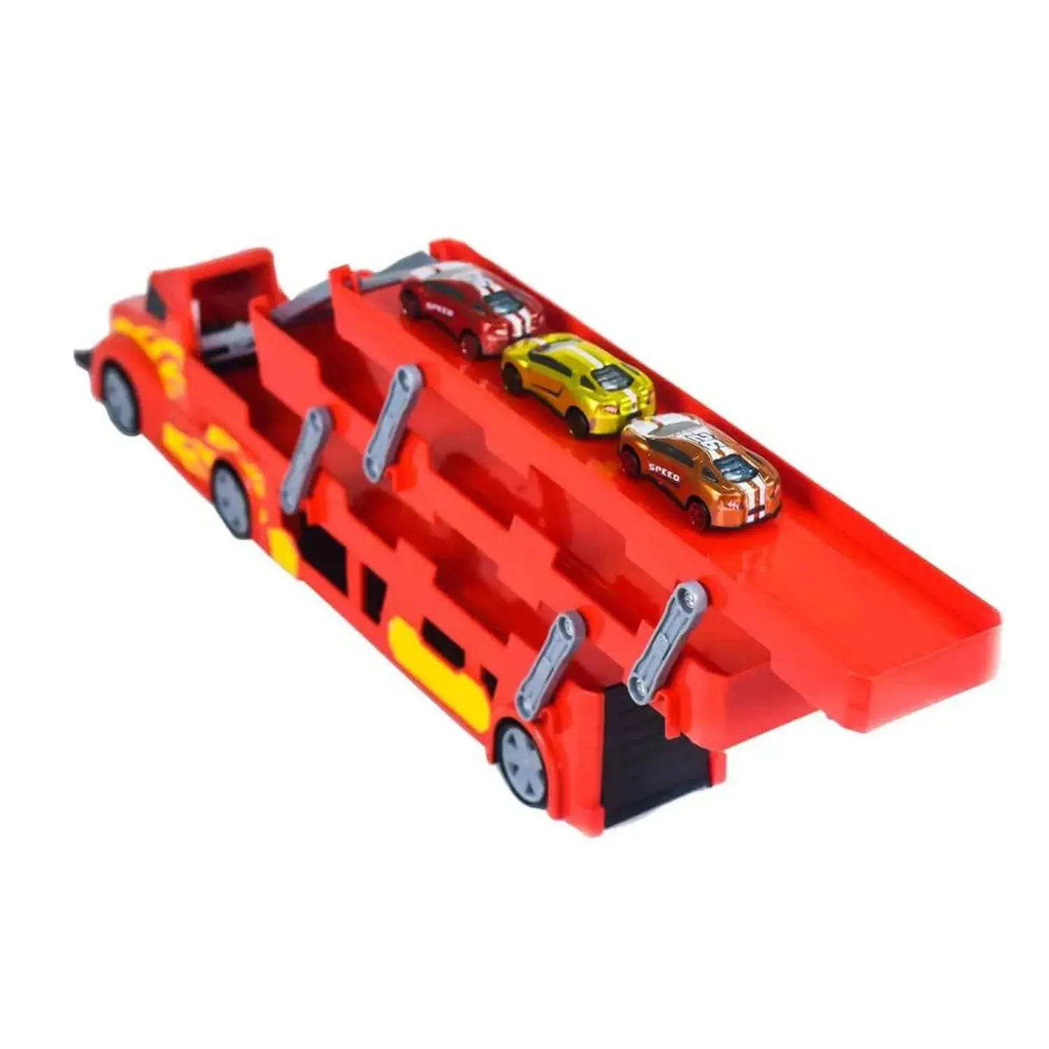 Transporter aracın arkasındaki 3 katı kaydırarak aç, kayma rampasını yerine yerleştir, araçları rampadan bırak ve hız dolu macerayı başlat!