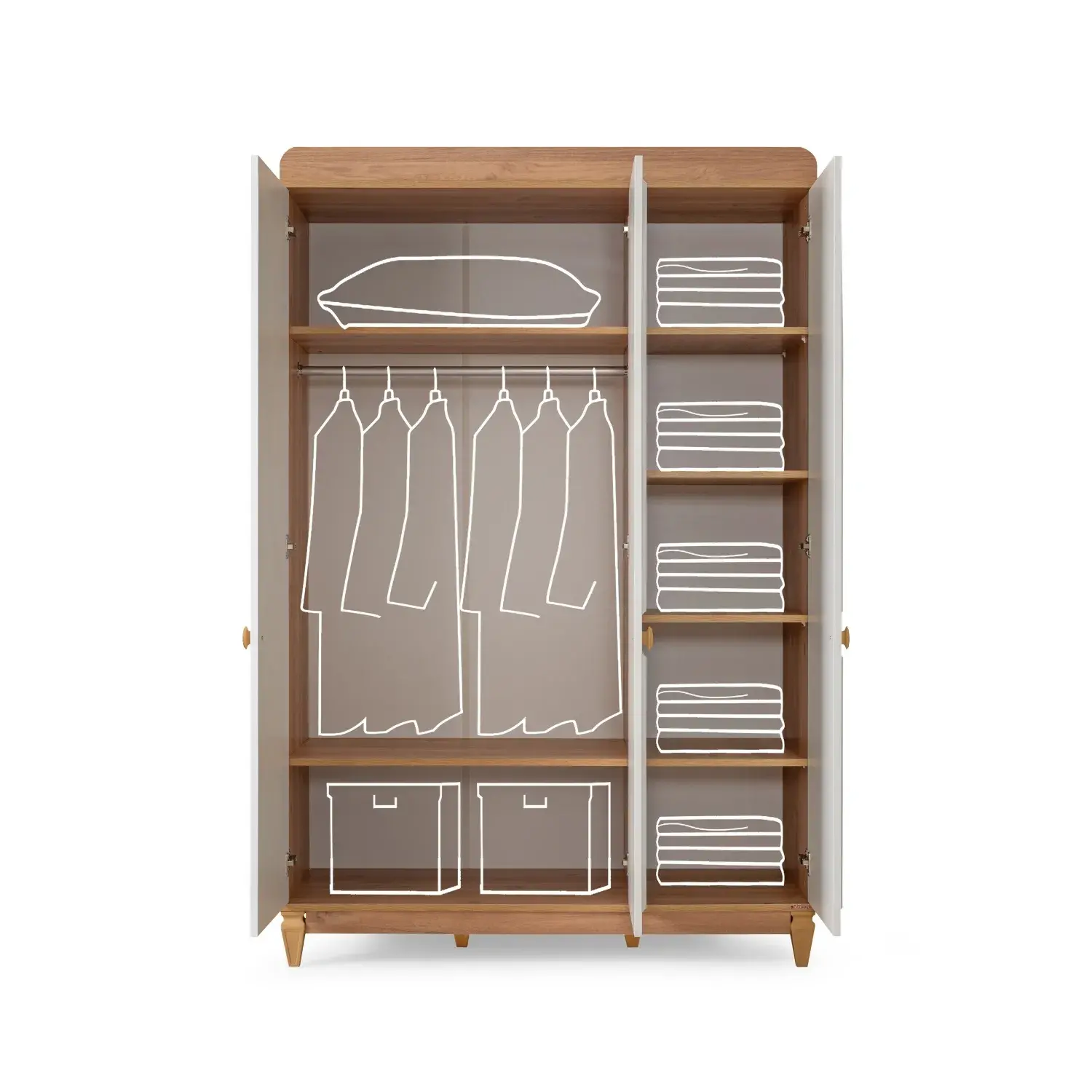 - Beyaz ve ahşap renk kombinasyonuyla farklı odalara kolayca uyum sağlar. Geniş modül çeşitliliği sayesinde ihtiyaçlara göre alternatif çözümler sunar.