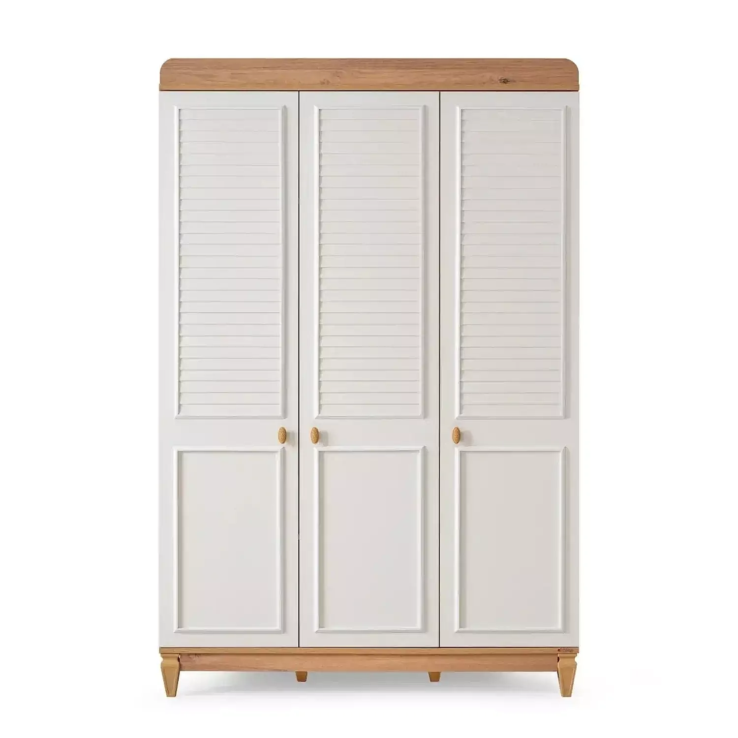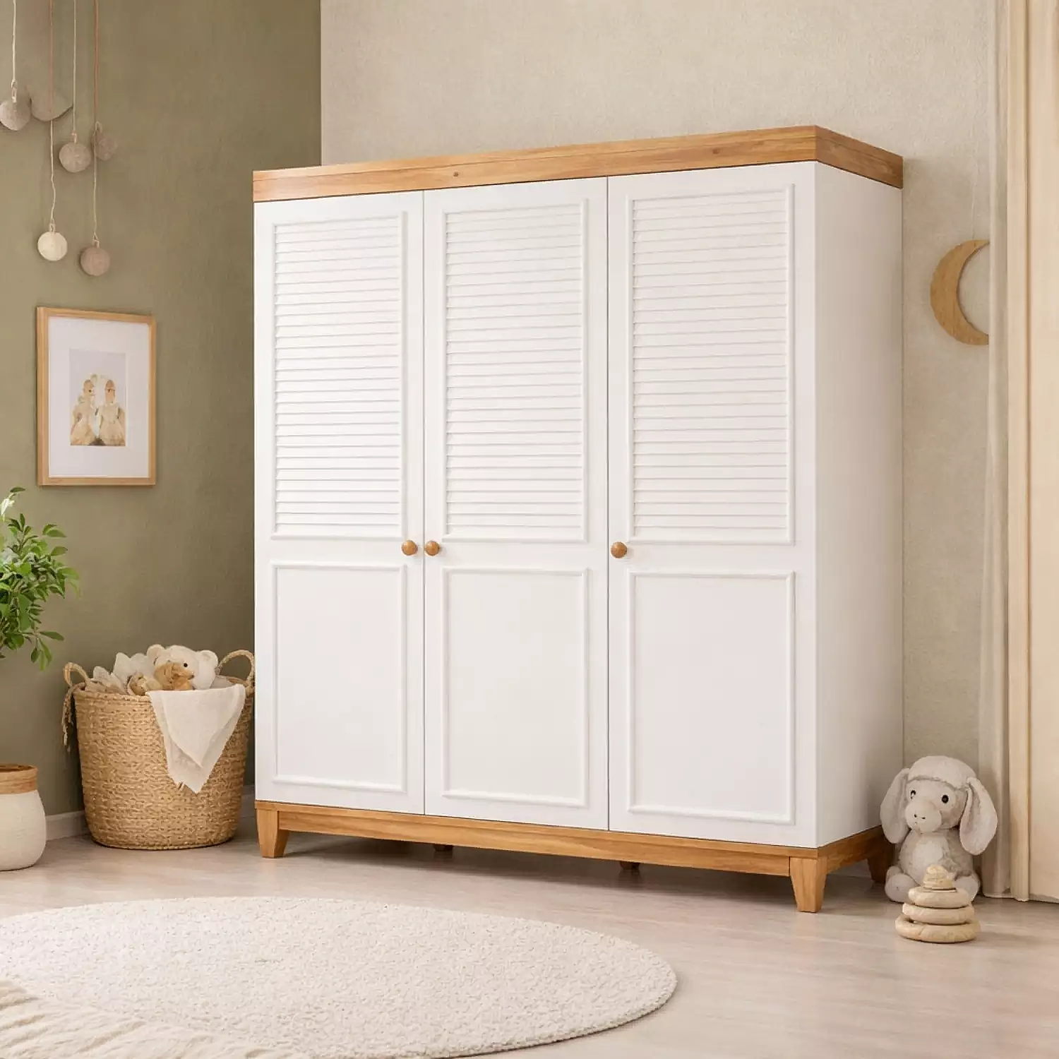 - Kapaklardaki panjur görünümü ve klapa detayları dolaba zarif bir dokunuş katarken, kendinden frenli menteşe sistemi ile sessiz ve güvenli bir kullanım sağlar. Yuvarlatılmış köşe tasarımı çocuklarınız için ekstra güvenlik sunarken, yüksek ayak yapısı sayesinde robot süpürgeyle kolay temizlik imkânı sunar.