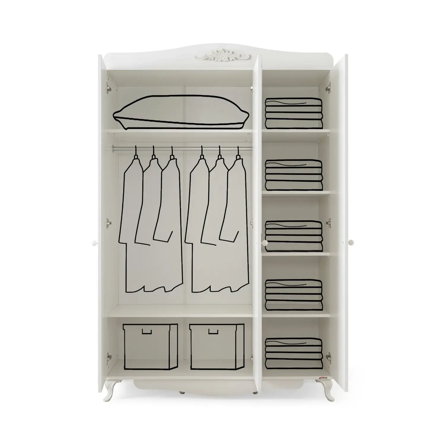 - Modern ve sade tasarımıyla öne çıkan Tiffany Jolie 3 Kapılı Dolap, bebek ve çocuk odalarının vazgeçilmez parçalarından biridir. Geniş iç hacmi sayesinde çocuğunuzun kıyafetlerini, ayakkabılarını, oyuncaklarını ve diğer eşyalarını düzenli bir şekilde saklamanıza yardımcı olur.