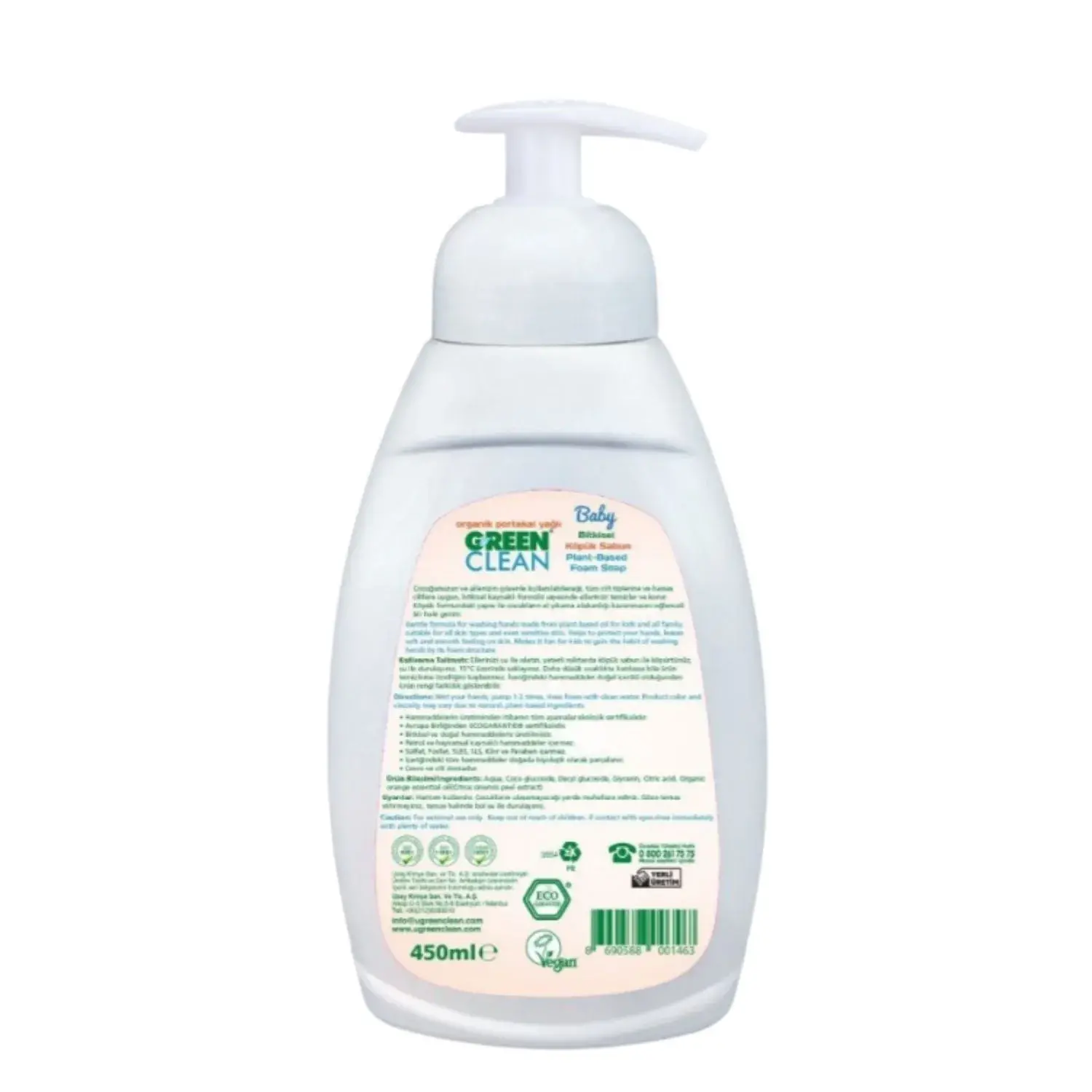 U Green Clean Baby Organik Portakal Yağlı Köpük Sabun 450 ml , tüm cilt tiplerinde güvenle kullanılır. Bebek ve hassas ciltlere de uygundur. Ellerinizi korur. Organik portakal kokusu sayesinde hoş bir koku bırakır.