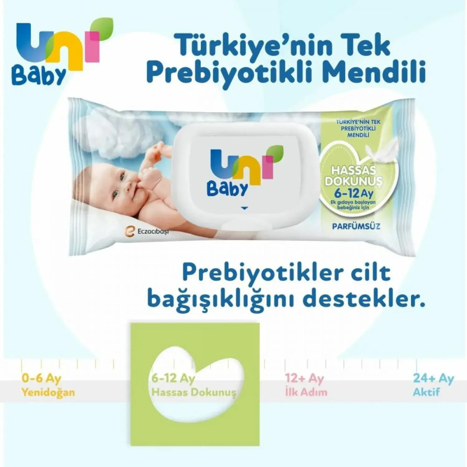 - Yeni Uni Baby Hassas Dokunuş Islak Mendil, içeriğindeki prebiyotikler sayesinde, cildin nemini uygulamadan hemen sonra 3 kata kadar* artırır.