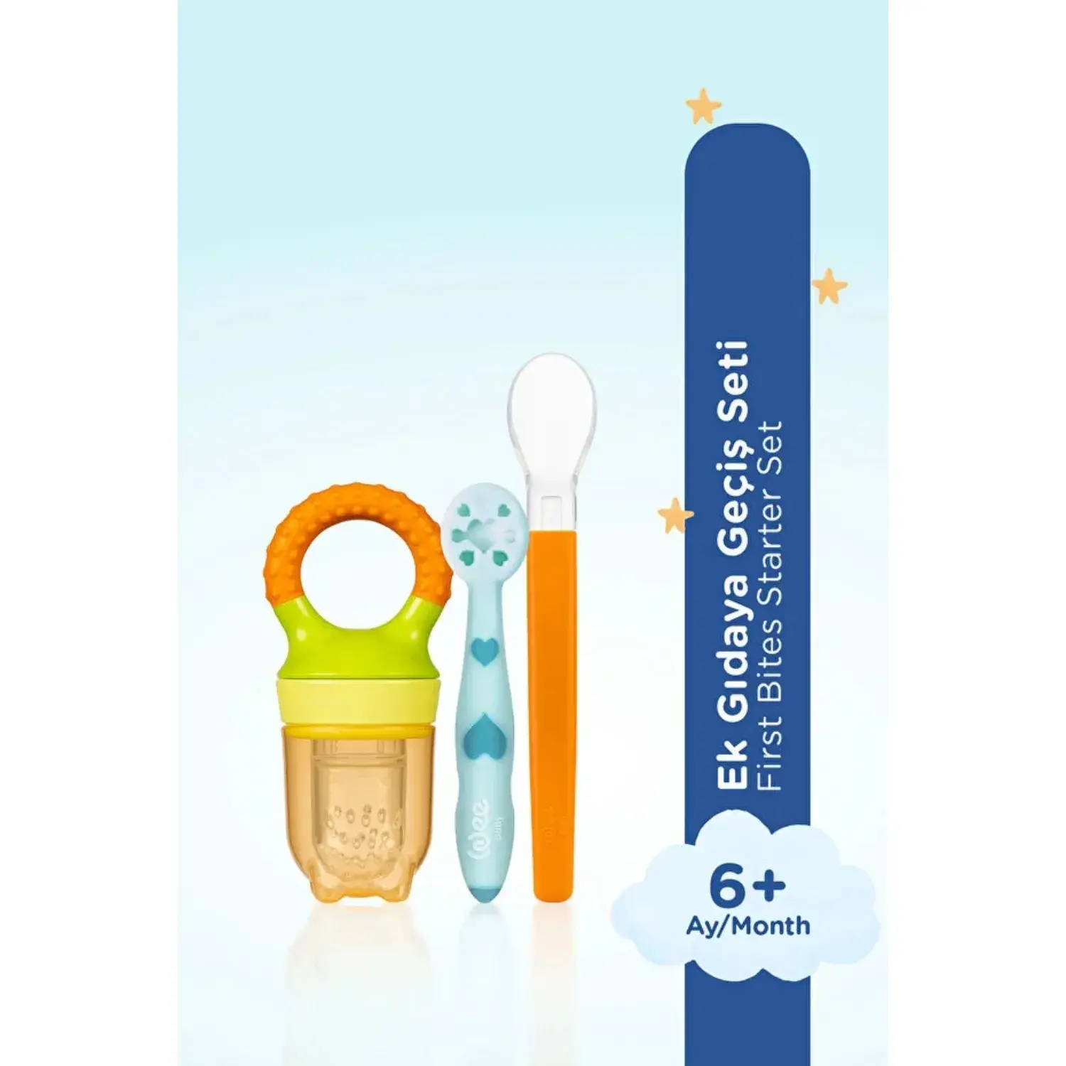 Ek gıdaya geçişte bebeğinizin her adımında yanında: Meyveyle tanışma, püreyle öğrenme, kaşıkla gelişme için özel olarak tasarlanmış 3 adımlı silikon uçlu set.