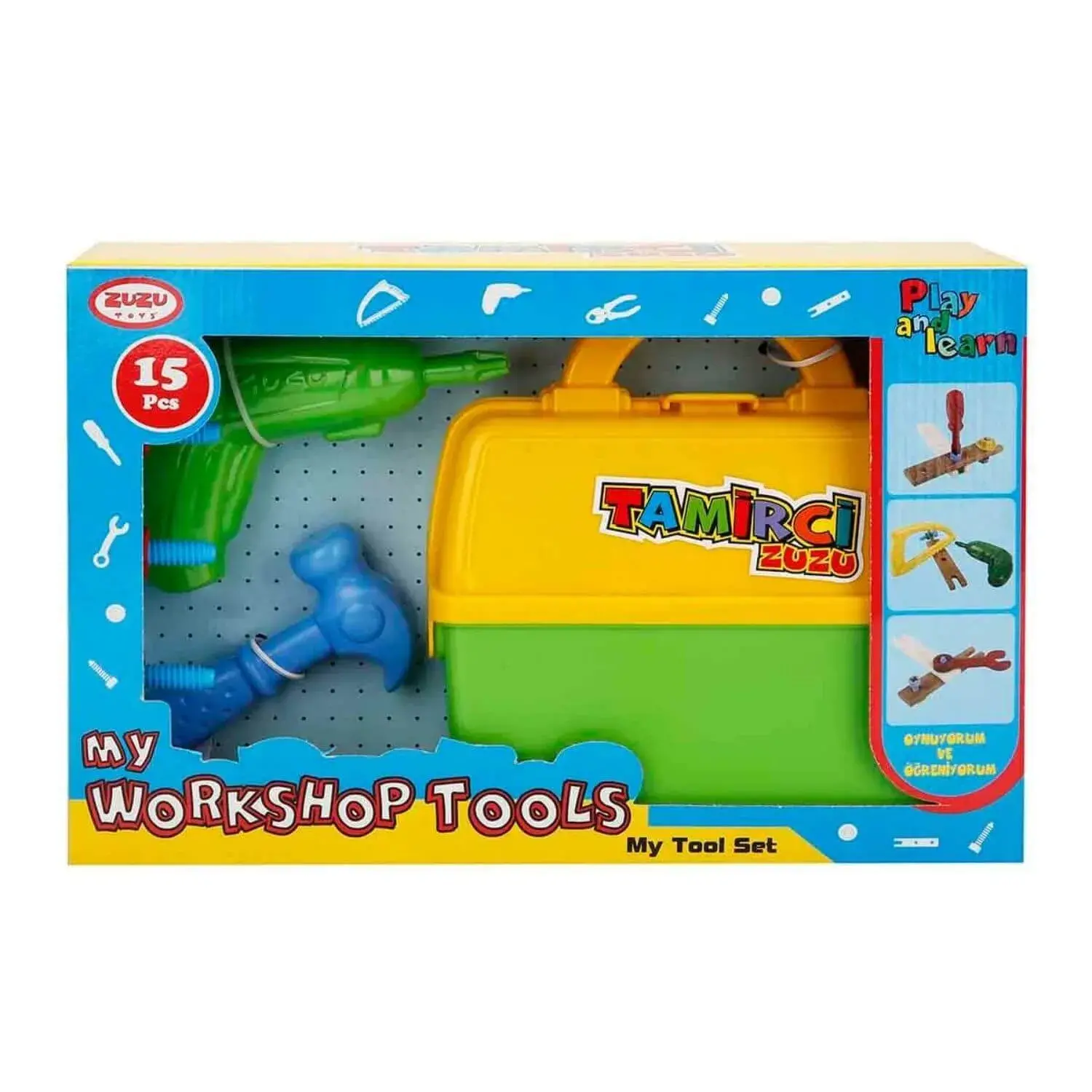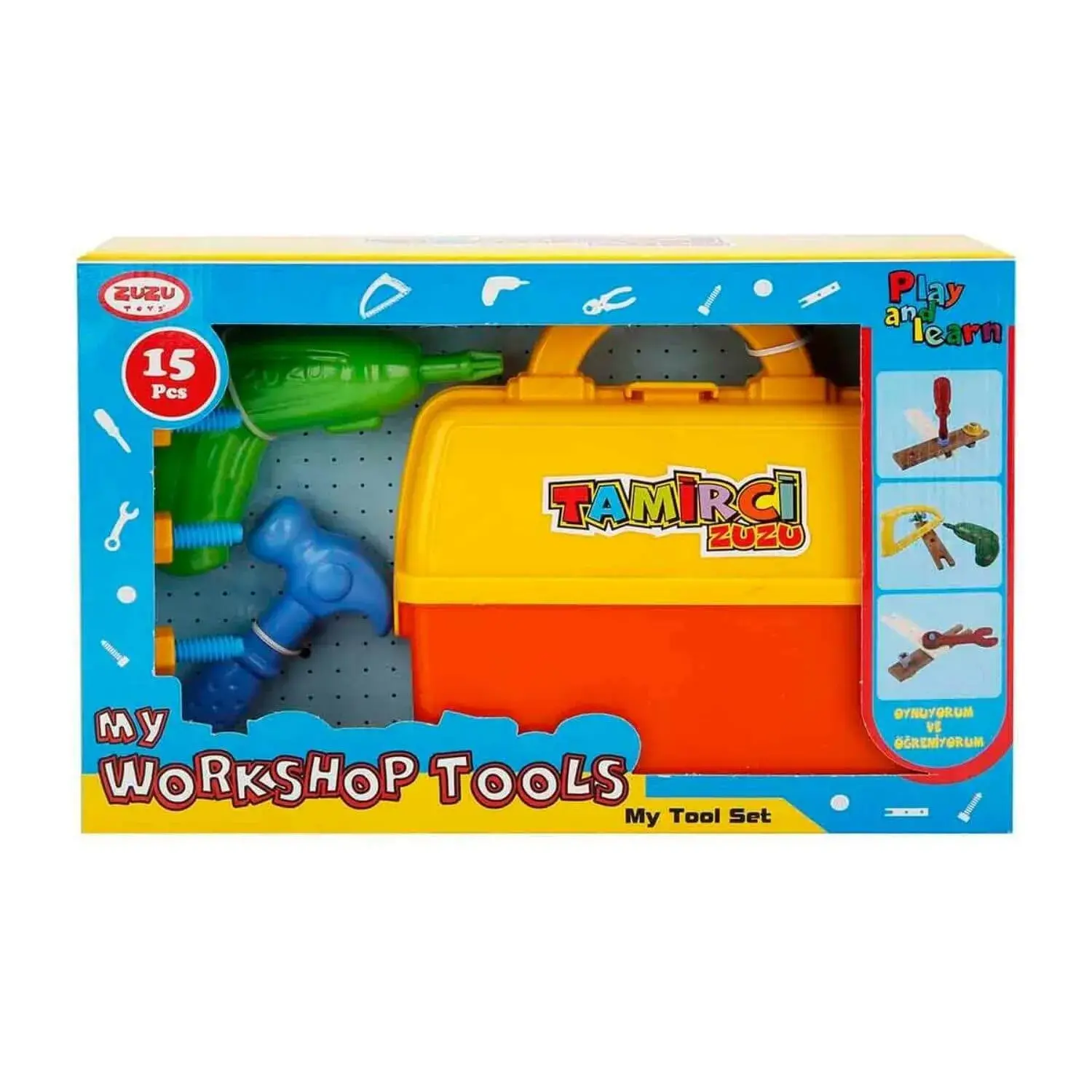 15 parçadan oluşan bu tamir setinde aradığınız her şey mevcut! Matkap, çekiç, çivi, tornavida, anahtar gibi gerçekçi detaylara sahip aletleri çocuklar hem tanıyacak hem de hayal güçlerindeki en güzel oyunları oynayabilecekler.